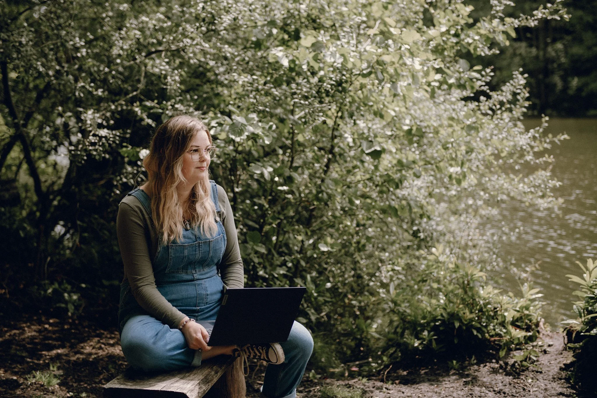 Amy Hughes - Psychotherapist sat next to a lake with her laptop